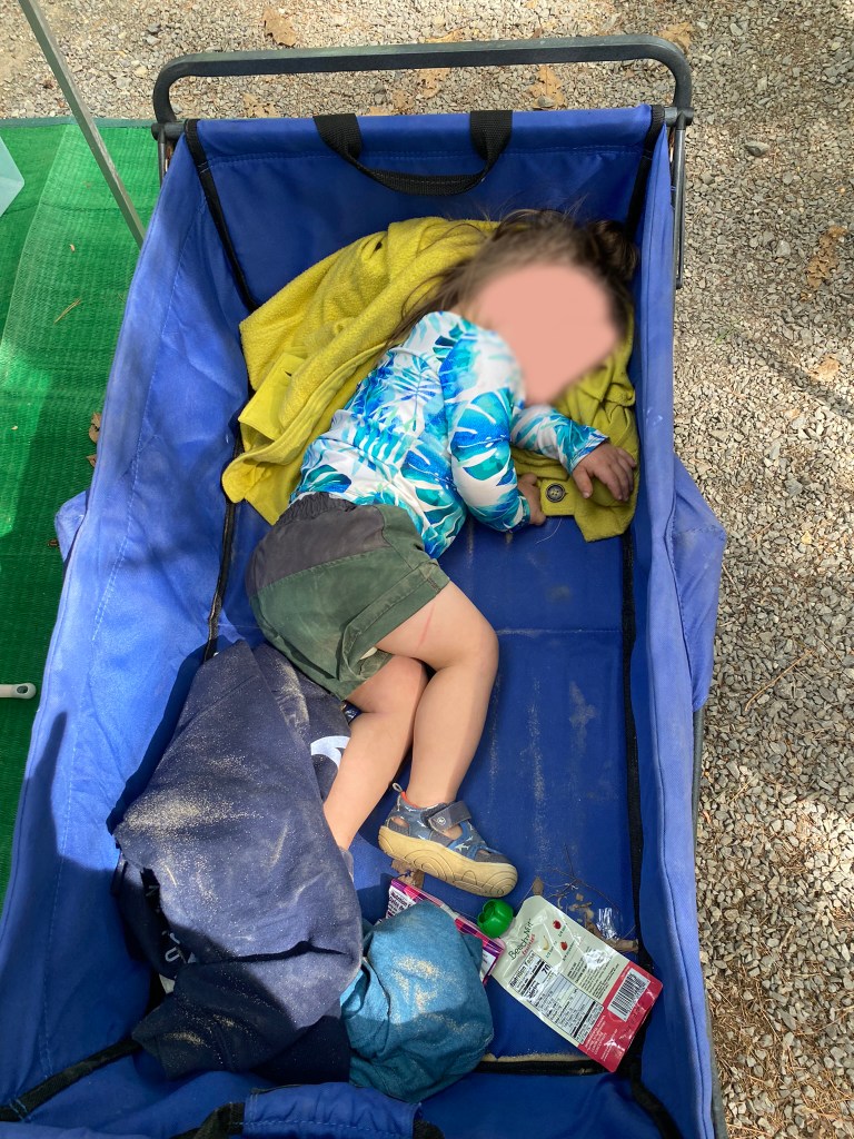 We also like to bring along a wagon for hauling kids around the campground. You can also bring along your stroller. We’ve laid a kid down in the wagon for an impromptu campfire nap and you can do the same with a stroller (especially if you can lay the seat almost flat).